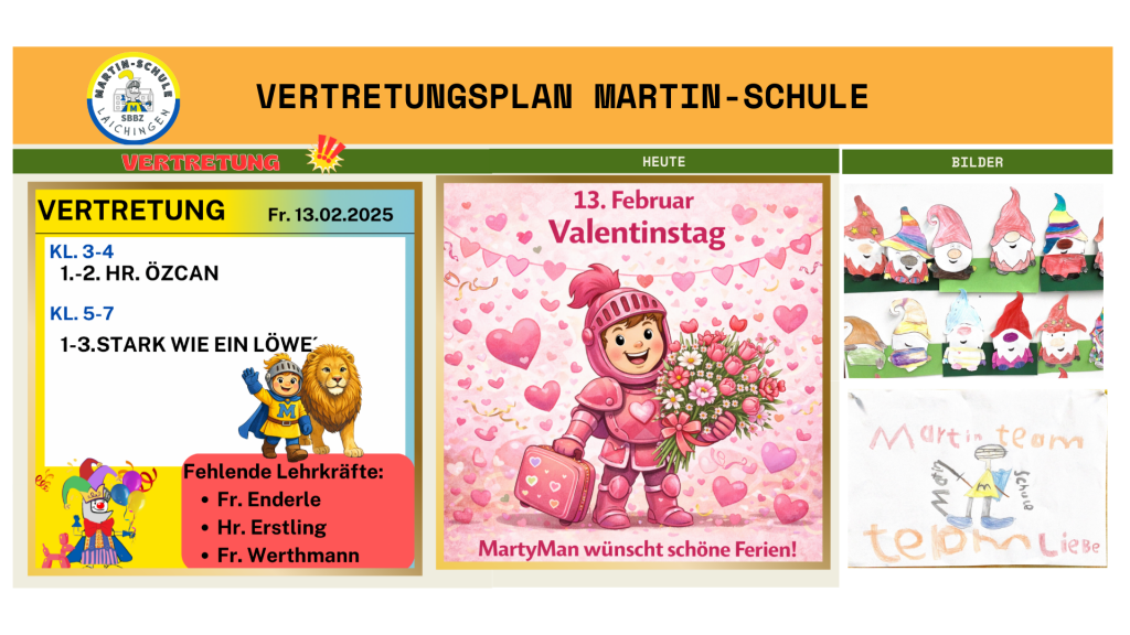 Er ist Namensgeber der MartyNews, erklärt Gästen die Räume auf den Zimmerschildern, begrüßt am Schuleingang und informiert Lehrkräfte wie Schülerinnen und Schüler täglich über wichtige Dinge – vom Vertretungsplan bis zu aktuellen Hinweisen.